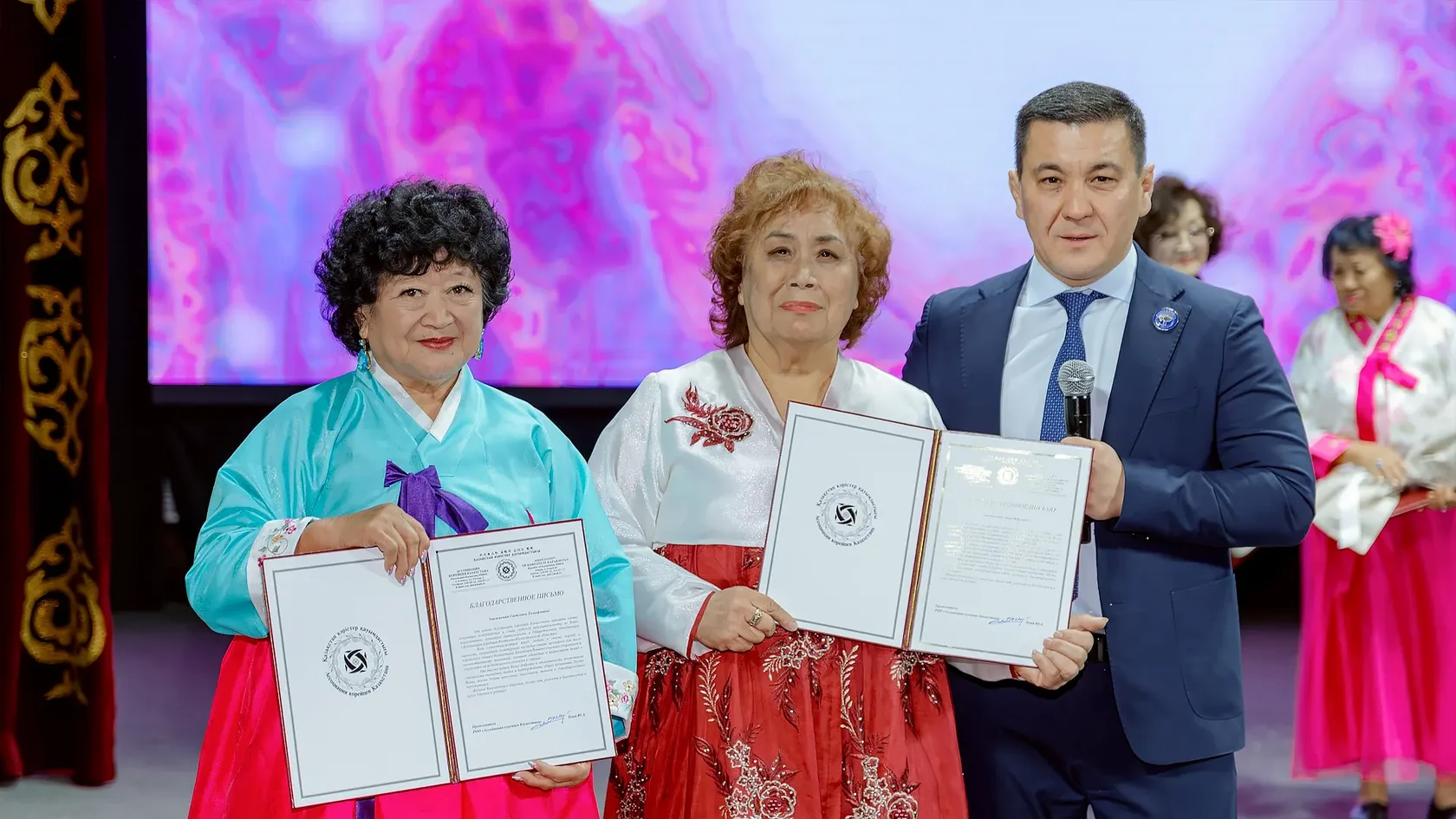 Іс-шара барысында корей мәдениетінің дамуына және аймақтағы қоғамдық келісімді нығайтуға елеулі үлес қосқан ардагерлер мен қауымдастықтың белсенді мүшелері марапатталды.